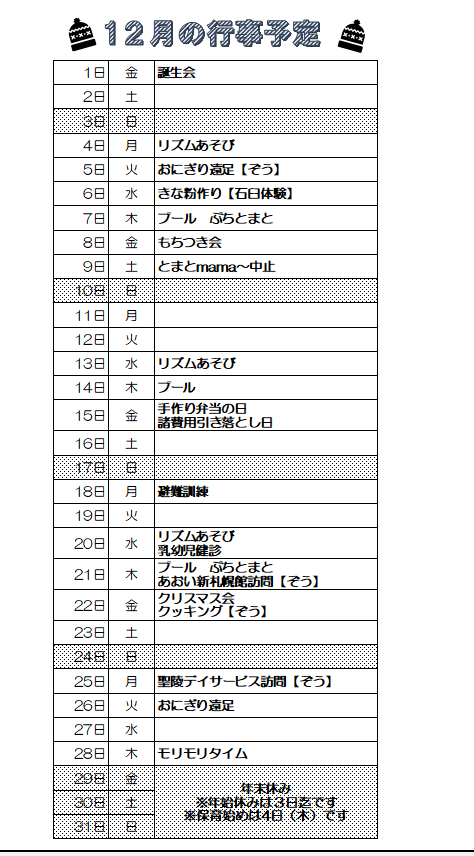 ぞう組は午睡がなくなり午後の時間が忙しく充実しています。今月は赤い服の「あの人」が来る月。体調に気を付けてみんなで会えるといいですね♬今日は···