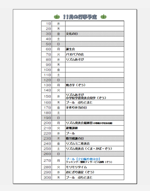 バタバタと毎日が過ぎていきますね。気が付けばもう11月!!今年もあと2ヶ月ですね今月の予定です。2日(木)に中止になったプールは27日(月)に振···
